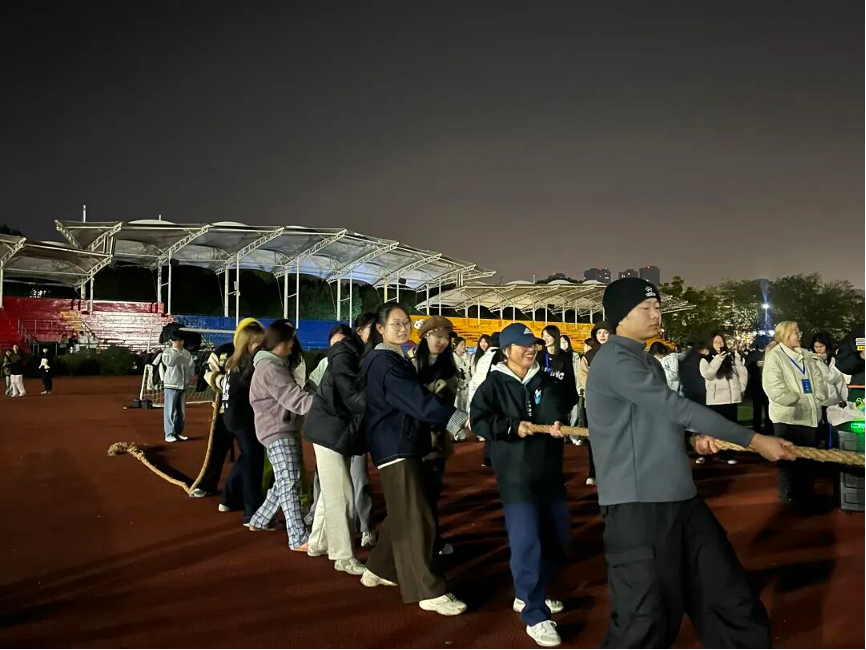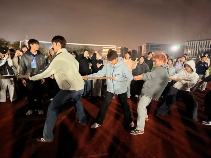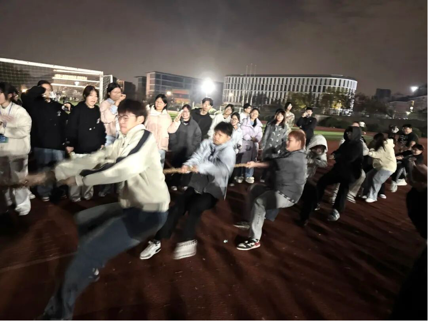 夜幕下的操场被灯光点亮,各班级代表队早早来到比赛场地,摩拳擦掌,跃跃欲试。裁判一声哨响,整个操场瞬间沸腾!参赛队员们紧握长绳,身体后倾,齐心协力向后拉拽;未参赛的同学自发组成啦啦队,为选手们加油助威。“一二,加油!一二,加油!”整齐划一的口号声回荡在校园夜空。绳子中央的红布时而僵持不动,时而左右移动,牵动着在场每一个人的心。这是一场力量与意志的较量,更是团队精神的完美诠释。