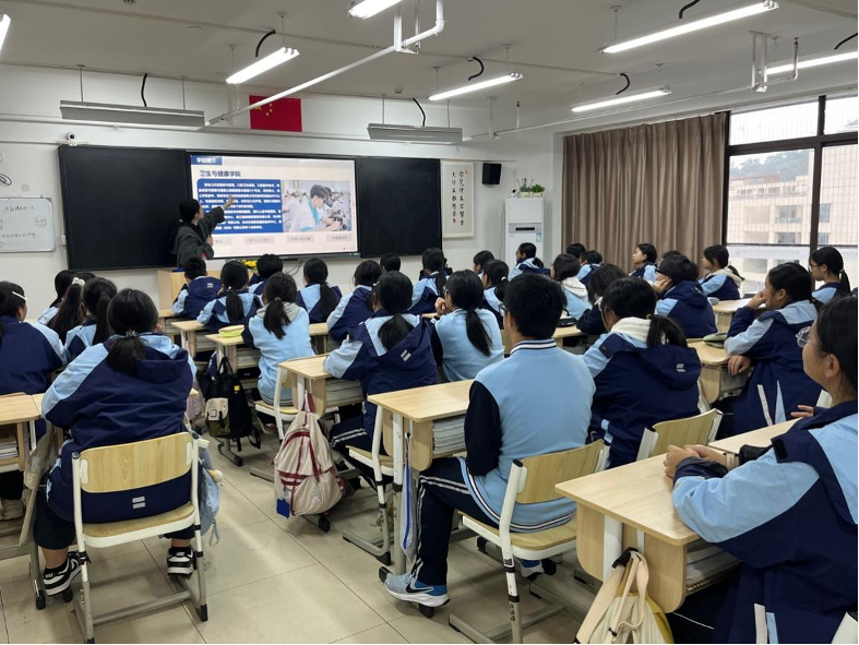 在校方陪同下,何老师实地参观了校园环境、教学场地、实训设施及学生宿舍,深入了解该校在专业建设、学生管理及职业素养培育等方面的举措与成效。宣讲环节,何娇薇老师以《数据赋能健康未来——健康大数据管理与服务专业的学习与成长之路》为题,面向全体五年制高一学生作专题分享。她从学校概况、专业特色、教学资源及就业前景等多个维度展开介绍,结合生动案例与详实数据,阐释了健康大数据管理与服务专业在数字化医疗背景下的发展潜力与实践价值。同学们认真聆听、积极互动,现场气氛活跃。在了解到高职阶段优质的教学条件、现代化的校园环境以及丰富的发展平台后,同学们反响热烈,并在问答环节围绕升学路径、校园生活、职业资格考证、实习就业等关心的问题踊跃提问,表达出对未来学业与职业发展的浓厚兴趣。