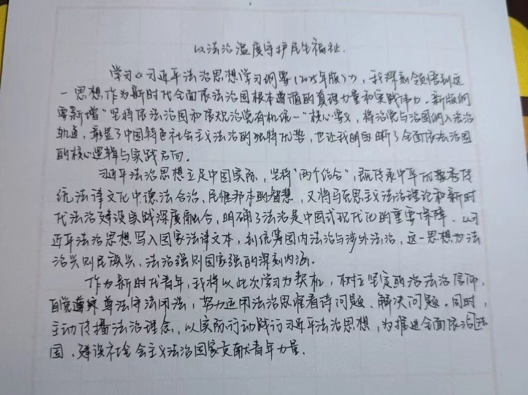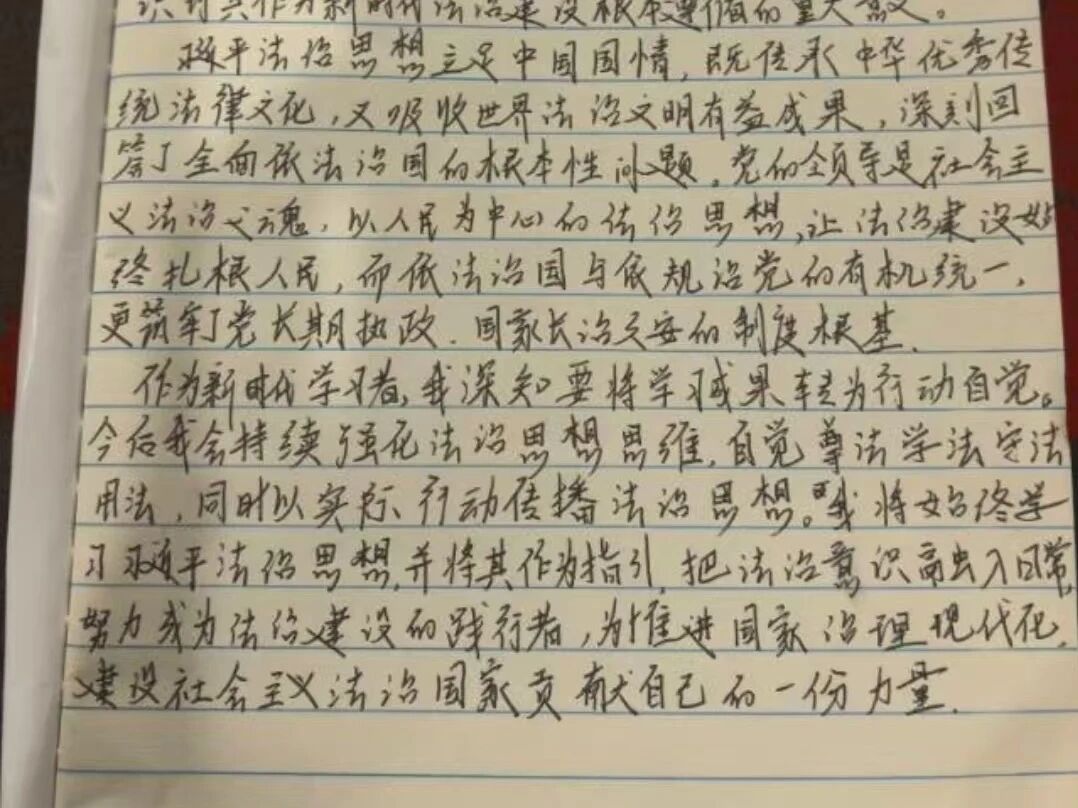 此次学习让我收获颇丰。习近平法治思想不是一成不变的教条,而是与时俱进的科学理论体系,是对新时代法治建设实践的理论升华,在今后的学习和工作中,我将持续把学习成果转化为推动工作的实际行动,坚持走中国特色社会主义法治道路,不断提升自身的法治素养,自觉用法治思维,分析解决问题,向身边人宣传法治思想,深刻学习,笃行实干,将习近平法治思想的核心要义内化于心,外化于行。