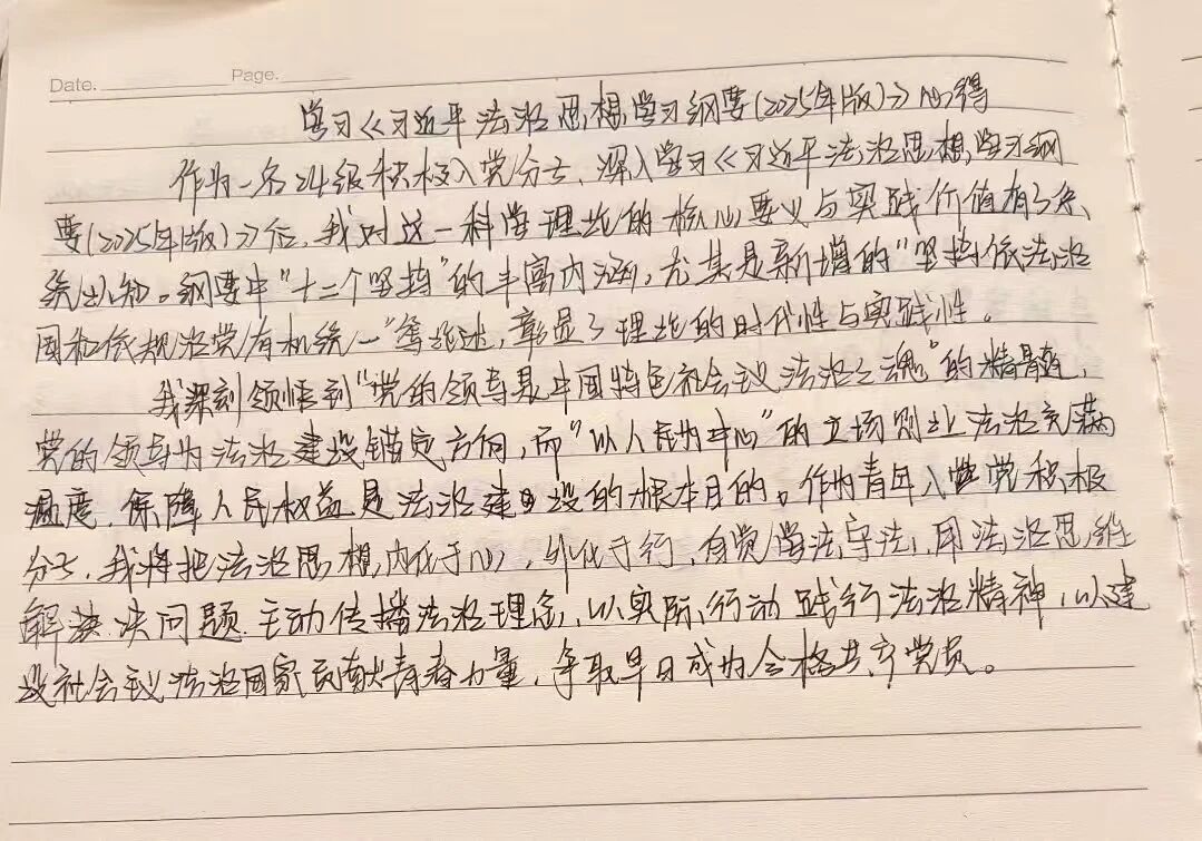 为深化党的创新理论武装,筑牢入党积极分子理想信念根基,近期我院依托假期组织全体入党积极分子开展《习近平法治思想学习纲要(2025年版)》自主研学。以“读原著、学原文、悟原理”推动专题学习走深走实,引导大家把握法治思想的理论精髓与实践路径,培育法治思维、厚植法治信仰,以理论学习锤炼政治品格,坚定向党组织靠拢的初心,将法治精神融入学习实践与日常言行,用青春践行新时代青年责任担当。